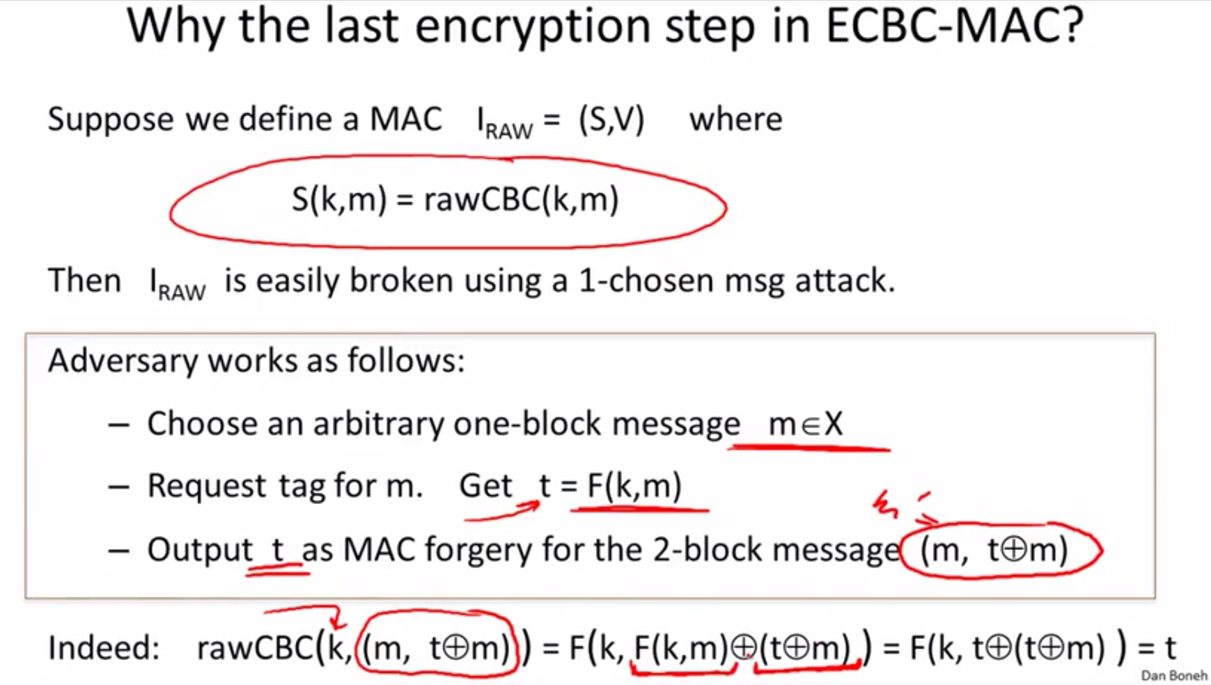 不经历最后一步 $k_1$ 加密的函数,在这个攻击里,攻击者先请求一个特定信息 m 的标签,信息 m 只有一个分组长,对一个单分组信息应用 CBC 意味着,只需要直接应用函数 f ,就获得了这个标签(即直接应用 f 在单分组信息 m 处的结果),现在攻击者有了t=F(k,m),现在我们声称他可以定义这个信息 m’ ,包含两个分组,第一个是 m ,第二个是 t⊕m ,我们声称刚刚收到的 t 是这两个分组的信息 m’ 的标签,t 是这个两分组信息m'=(m,t⊕m)的有效 MAC ,攻击者可以产生这个有效的标签 t ,而这个两份组的信息是从未被询问过的,因此,他可以破解这个 MAC 。