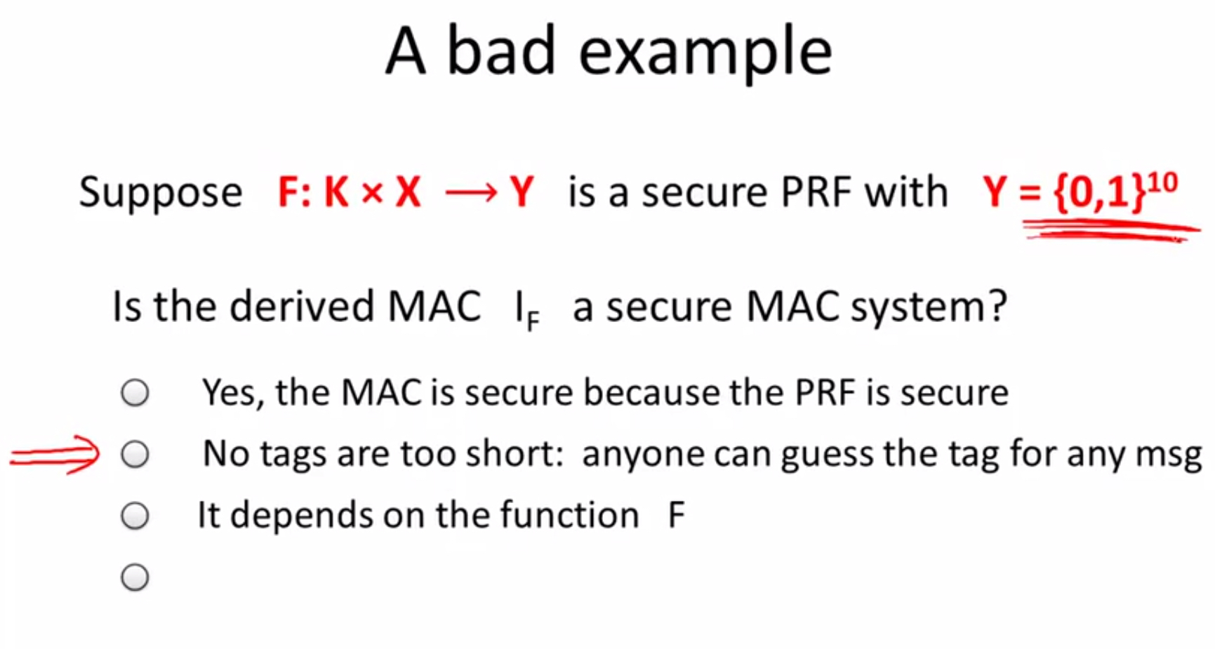 在如下例题中的 MAC 是不安全的,因为标签太短(当且仅当函数输出太小,才会有问题,如果PRF的输出很大,就可以获得一个安全的 MAC),攻击者有 1/2^(10) 的机会猜中 MAC。对这个MAC 的优势如下: