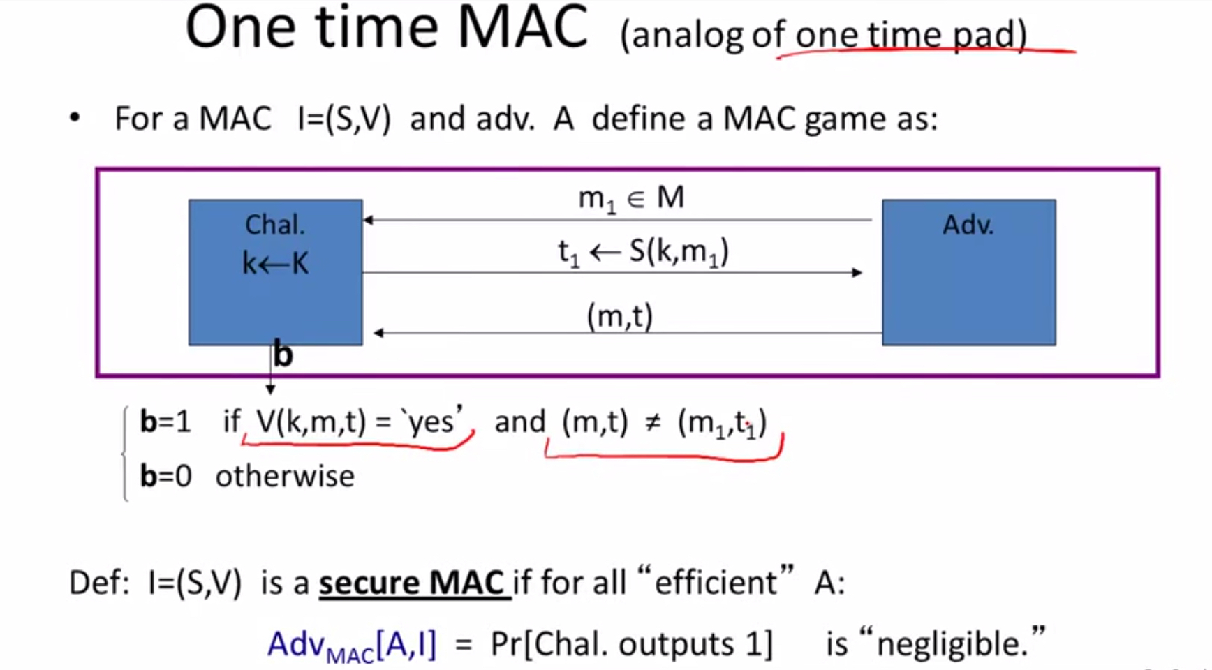 我们定义安全性游戏,只允许攻击者做一次选择信息攻击,那么,他只提交一个信息的询问,然后得到了这个询问信息对应的标签。现在攻击者的目标是伪造一对信息-标签。当我们只想使用一个密钥,为单条信息提供加密或完整性,通常,我们说一次性 MAC 是安全的,因为没有攻击者可以赢得这场游戏。