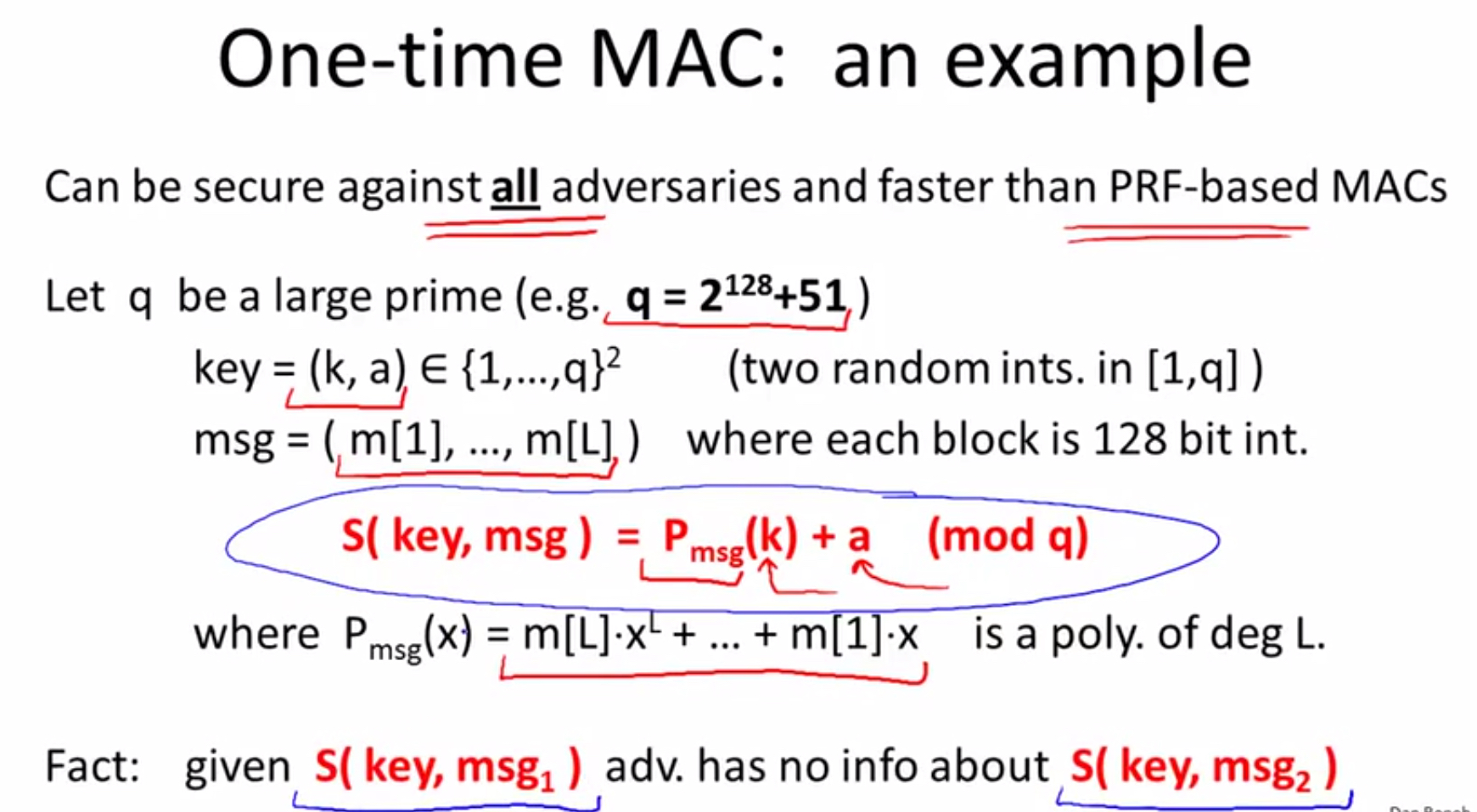 工作过程:首先,选取一个比分组大小略大的质数,当我们使用 128 位分组时,我们选的第一个质数大于 2^128 ,质数选为 2^128+51 ,现在这个密钥是一对随机数,它们的取值范围从 1 到我们选的质数 q ,现在我们有一个信息,把它分成若干分组,每个分组 128 位,我们把每个分组里的数视为整数,范围从 0 到 2^128 - 1。现在 MAC 如下定义:首先,我们去我们的分组信息构建它们的多项式,如果信息中有 L 个 分组,我们构建一个 L 次多项式,注意多项式的常数项设为 0 ,我们去信息对应的多项式,计算它在点 K 的值,K 是我们密钥的一半,然后加上 A ,A 是我们密钥的另一半,最后结果取模。这个 MAC 是安全的,如果我告诉你一个特定信息的 MAC 值,并不会告诉你任何关于另一信息的 MAC 的任何信息,因此,即使你已经看过一条信息的 MAC ,你也无法伪造其他信息的 MAC ,但如果你看到了两条信息的 MAC ,那将完全暴露了密钥,MAC 就是可伪造的了。