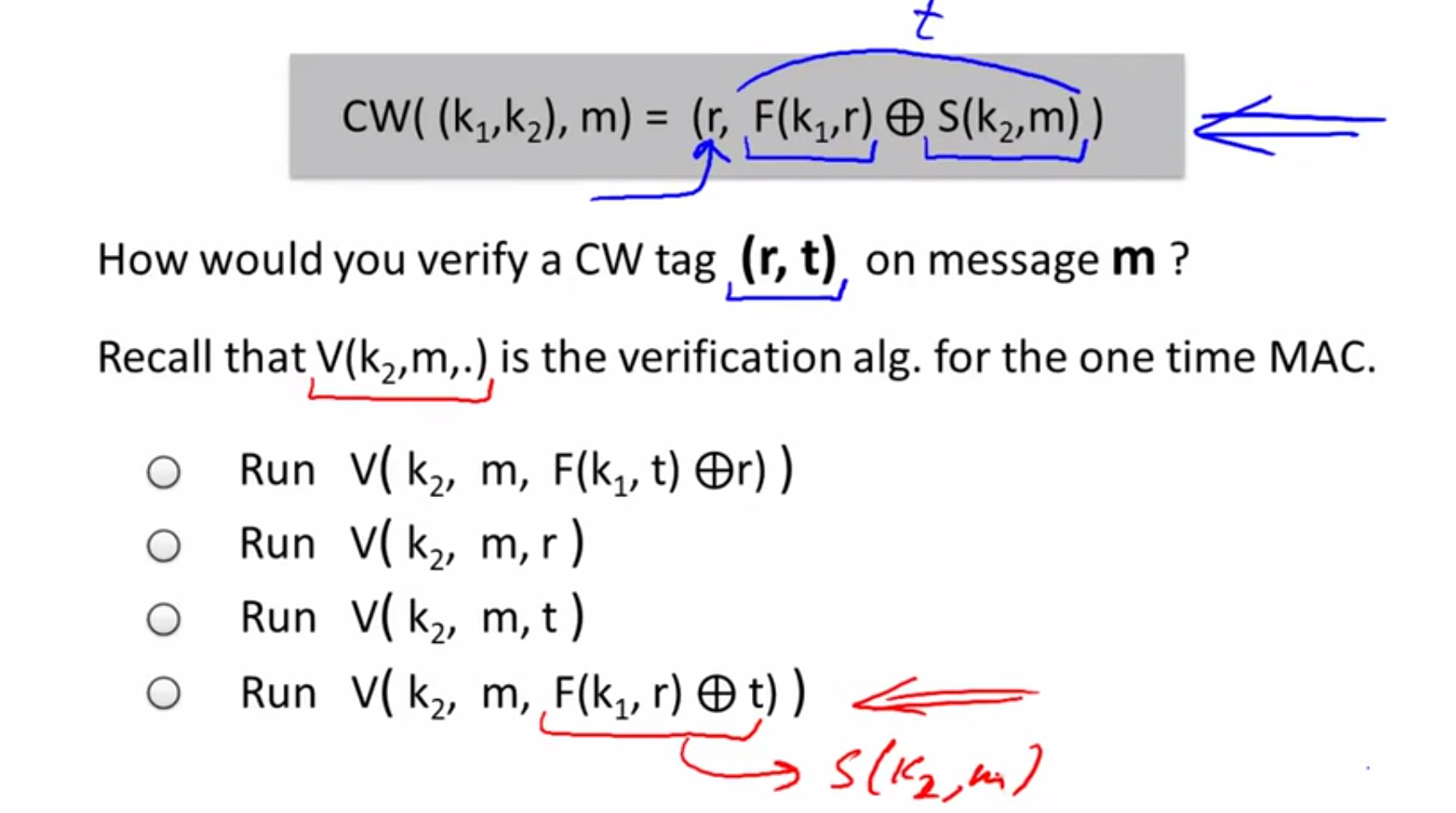 现在有一个通用的方法可以把一次性 MAC 转变成多次 MAC。假设我们有一次性 MAC ,签名和验证算法分别为 S 和 V ,我们假设签名本身是 n 位 字符串,另外,我们看一个安全的 PRF ,它也正好输出 n 位字符串,但也取 n 位字符串,现在定义一个通用的 MAC 构建,这些 MAC 叫做 Carter-Wegman MAC ,它如下工作:我们对信息 M 应用一次性 MAC ,然后我们用 PRF 加密结果,我们选择一个随机数 r ,根据 r 计算一个一次性密码本,通过对 r 应用 PRF ,然后我们把结果与一次性 MAC 异或,在这个机制里,快速的一次性 MAC 被用到了可能有几个 G 的长信息上,而费时的 PRF 只被应用在新鲜值 r 上,r 接着被用来加密 MAC 的最后结果。