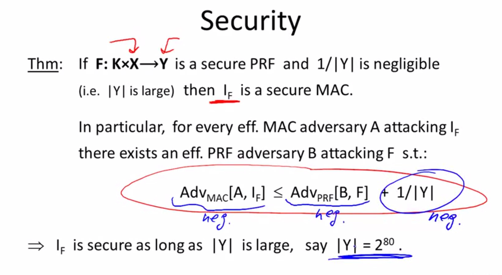 要想获得安全的 MAC,我们需要输出空间很大,例如:取一个 PRF,输出 80 位就很好了,它会产生 80 位 MAC,因此任意攻击者的优势最多是 1/2^(80)。