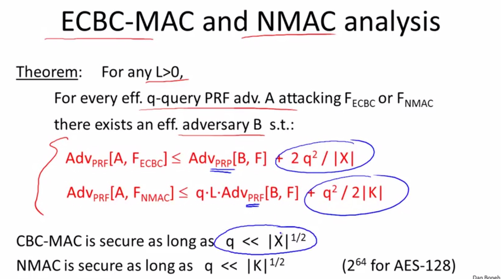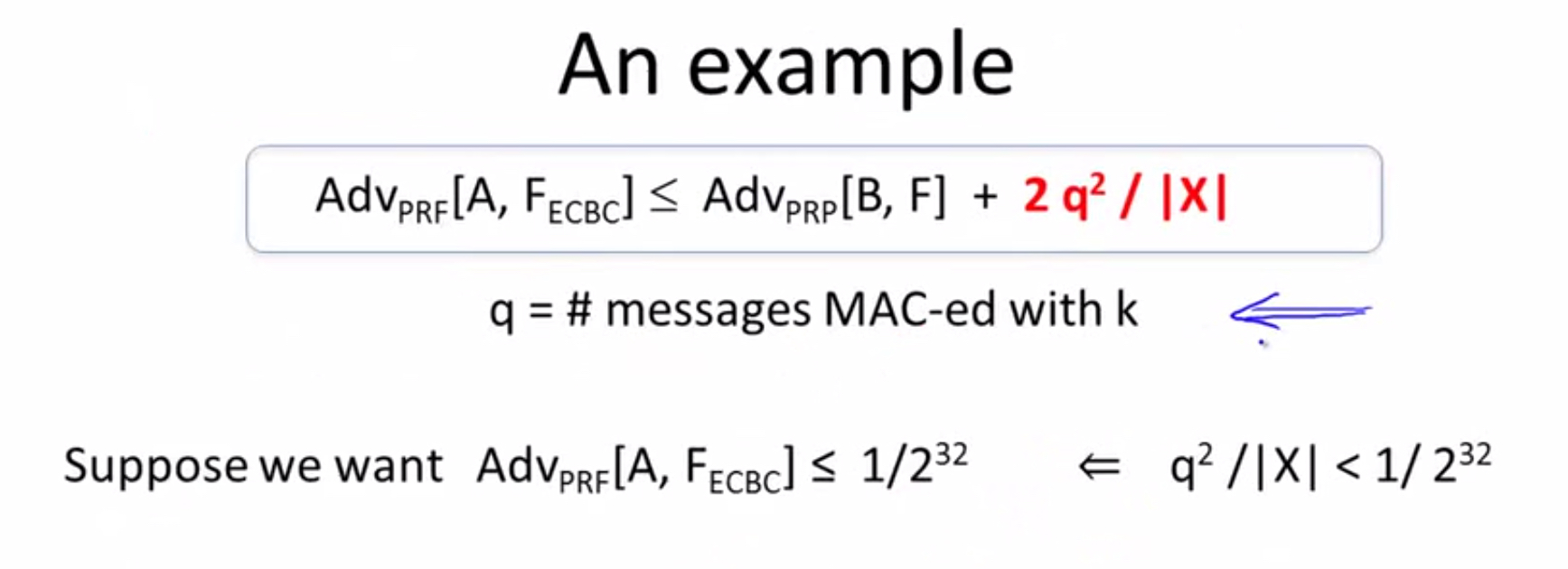q 是询问的信息数,并用一个特定密钥计算 MAC ,假设我们想确保所有的攻击者区分 PRF 和真随机函数的优势都小于 1/2^32 ,根据安全性定理,这意味着我们需要确保 (q^2)/|X| < 1/2^32,超过了 32 这个安全长度就必须更换密钥。