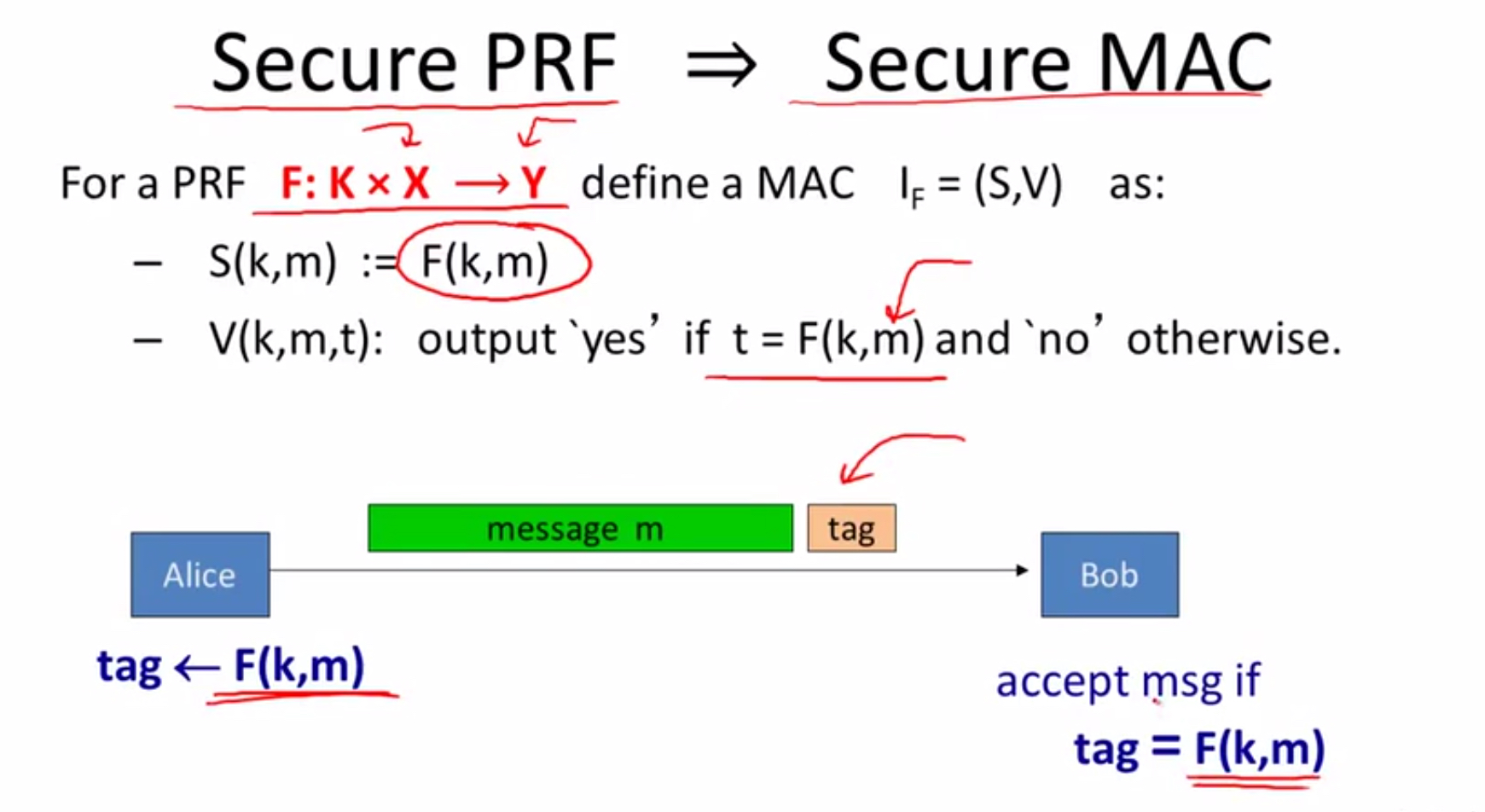 假设我们有一个伪随机函数 PRF,这个 PRF 取输入 X,输出 Y,F:K×X→Y,定义如下 MAC 为信息 M 签名,S(k,m):= F(k,m),即计算函数在 M 处的值,信息 M 的标签就是在点 M 处的函数值,然后通过这一对验证信息,方法就是重新计算在信息 M 处的函数值检查结果是否等于给我们的标签,如果一样,我们说“是”,否则我们拒绝。