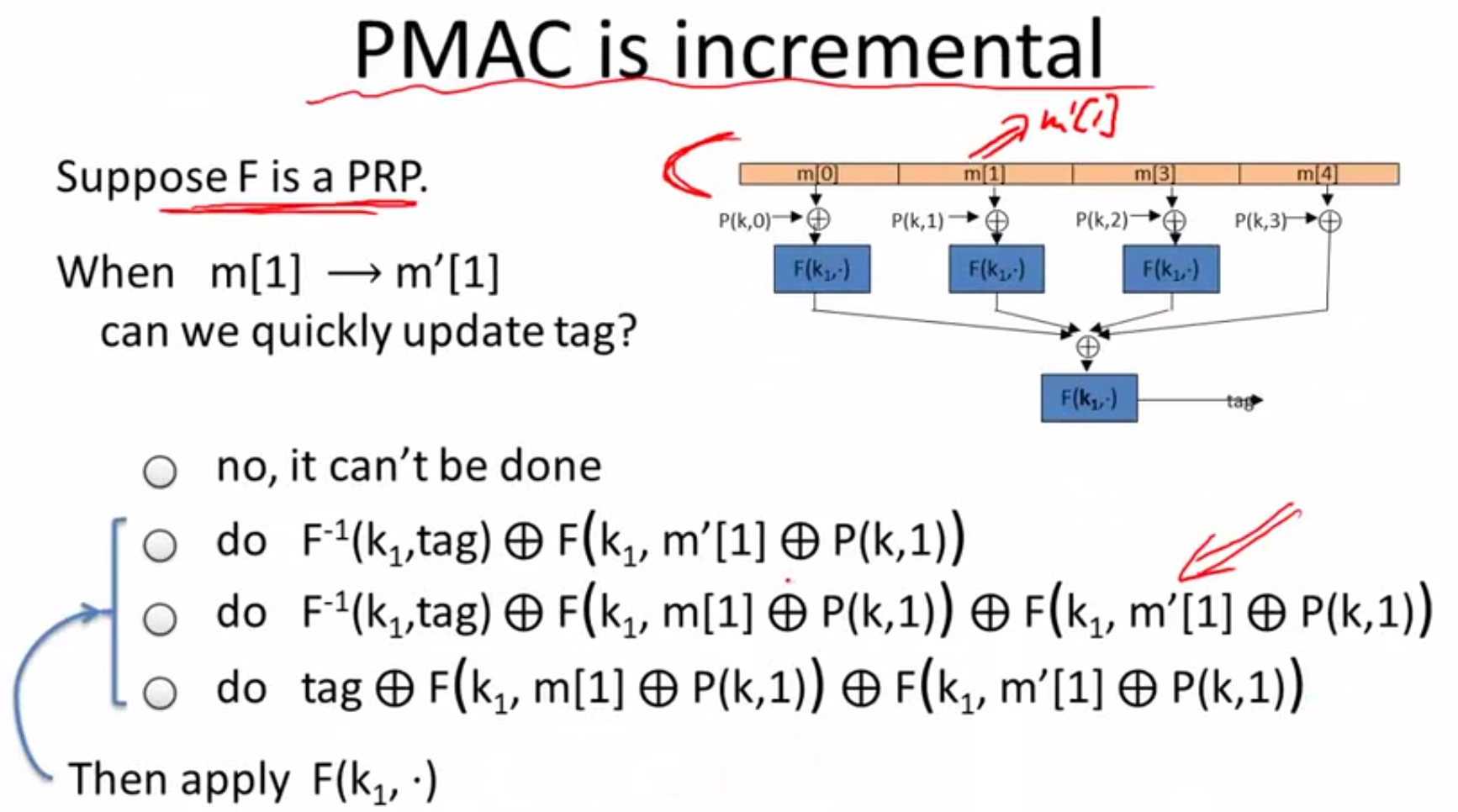 假设用来构建 PMAC 的函数 F 不仅是 PRF ,而且是 PRP,那么我们能在需要时求 F 的逆,现在假设我们已计算长信息 m 的 MAC,假设这个长信息的一个分组发生了变化,m[1] 变成了 m’[1],但其他分组不变,对于其它 MAC 机制,比如 CBC-MAC ,即使只有一个分组变化了,我们还是需要重新计算整个信息的标签,重新计算标签需要的时间与信息长度成正比。实际上用 PMAC ,如果我们只变化一个分组或是很少的分组,我们可以很快就完成标签的重新计算。由于使用的是 PRP ,取改变前原信息的标签,我们可以求函数 F 的逆,确定应用函数 F 之前的值,现在我们有了所有分组的异或值,我们可以抵消掉来自原分组的异或部分,将 所有分组的异或值 与 原信息分组传到异或加法器的值 进行异或,再异或 来自新分组传到异或加法器的值,然后再应用函数 F ,就得到新信息的标签。
