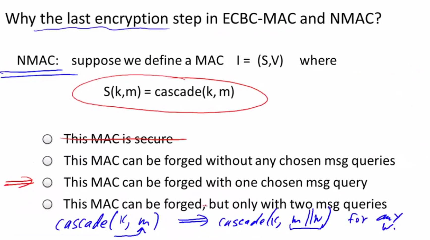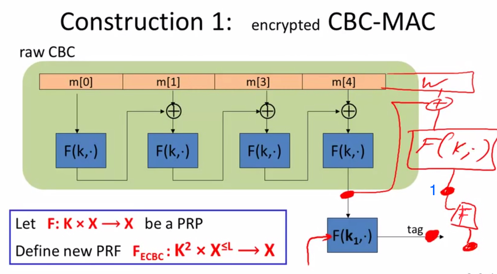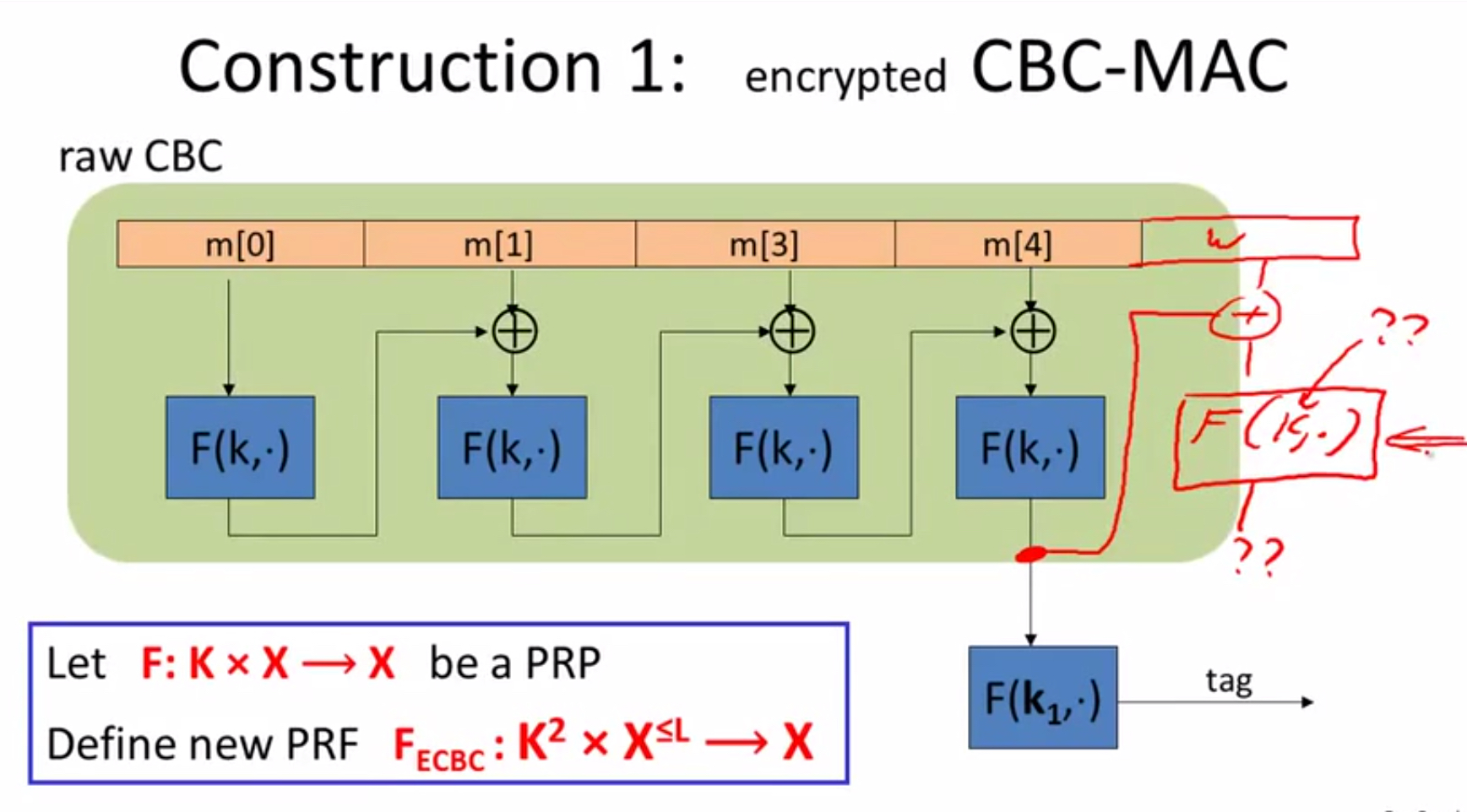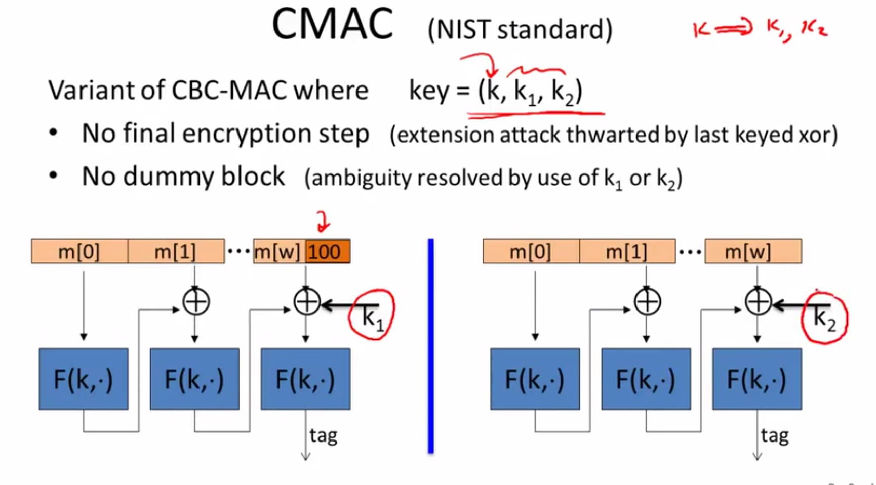 不经历最后一步 $k_1$ 加密的函数,为级联函数。不是安全的 MAC。最后一步的加密阻止了扩展攻击,扩展攻击是针对级联的唯一一种攻击。