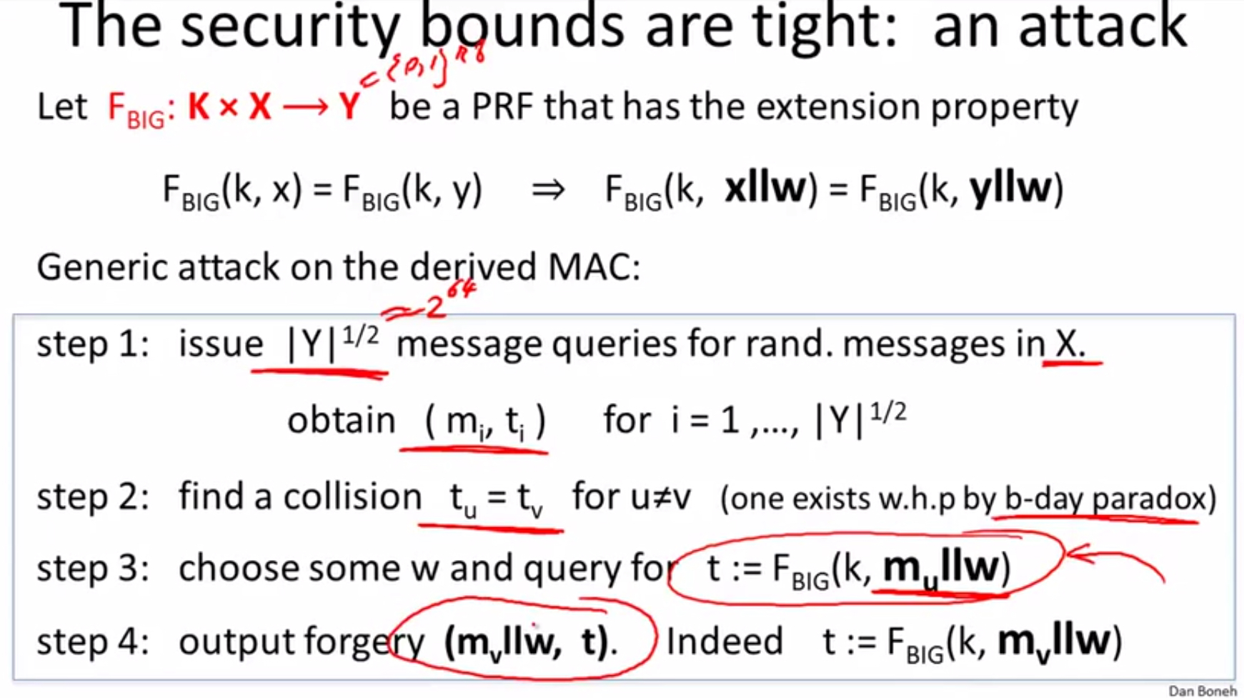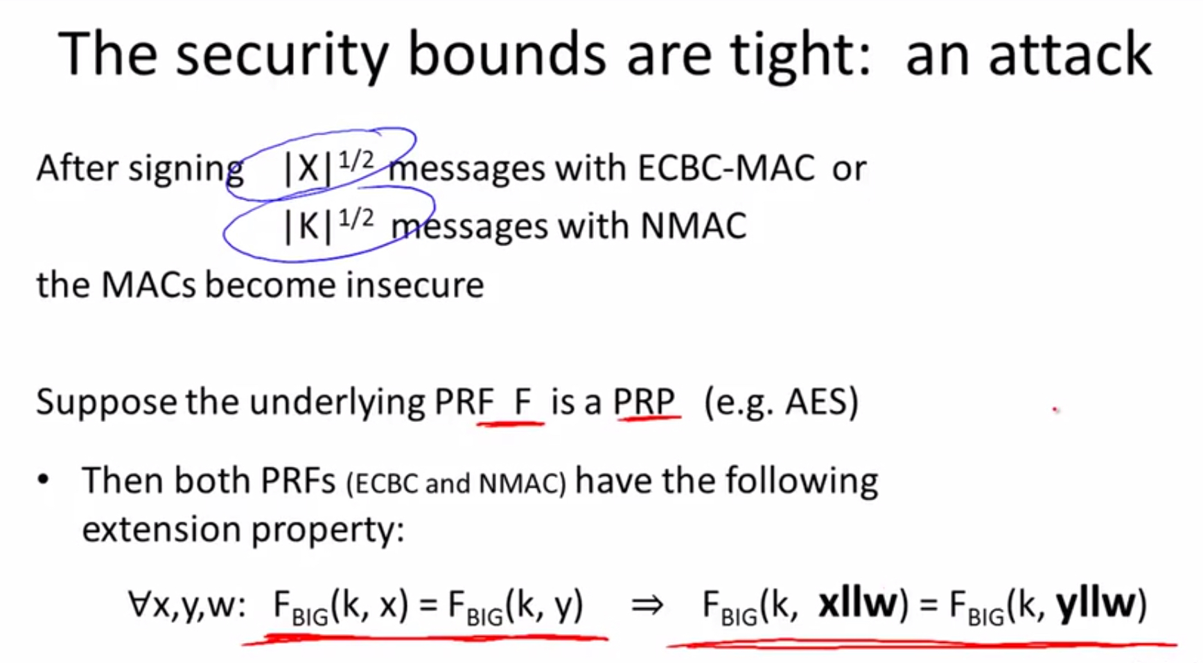 针对 PRF ,同时也是针对 ECBC 和 NMAC 的攻击:假设底层函数是 PRP ,是类似 AES 的分组密码,记为 F ,F 可以是 F_ECBC 或 F_NMAC ,F 意味着这是一个针对长信息的 PRF 。现在,实际上两种机制都有如下的扩展性质,如果给我一个碰撞,发生在信息 X 和 Y 上,那么事实上,这也意味着有一个碰撞发生在 X 和 Y 的扩展上,换句话说,如果我把 W 各附在 X 和 Y 的后面,我也会在这些信息上获得一个碰撞,那么很难说服自己这个扩展性质是成立的。