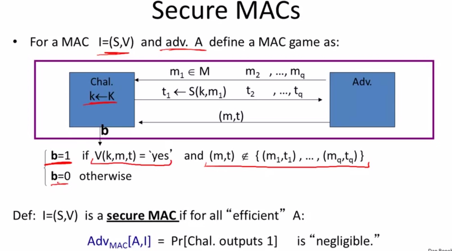 有两个算法 S 和 V ,有一个攻击者A ,游戏如下:挑战者通常为 MAC 选择一个随机密钥,攻击者进行他的选择信息攻击,他提交 $m_1$ 给挑战者,获得 $m_1$ 的标签,然后提交 $m_2$ 给挑战者,获得 $m_2$ 的标签,直到他提交了 q 个信息给挑战者,获得了 q 个这些信息的标签,这是选择信息攻击的部分,然后攻击者继续试图进行存在性伪造,他输出一个新的信息标签对我们就说他赢下这场游戏,换句话说,b=1 表示他赢下这场游戏。通常,我们定义攻击者的优势等于挑战者在本游戏中输出 1 的概率。安全的MAC系统,对所有有效的攻击者,优势都是可忽略的,换句话说,没有有效的攻击者能够以不可忽视的概率赢得这个游戏。