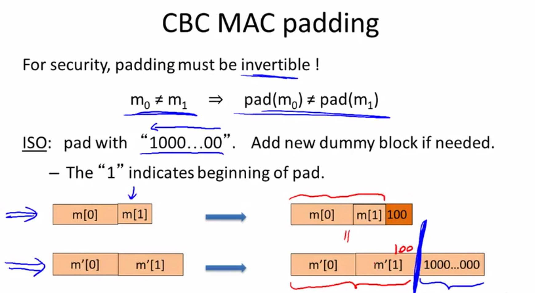 补齐函数本身必须是一一映射的函数,换句话说,它应当是将两个不同的信息映射到不同的两个补齐的信息,不应该在补齐函数上有碰撞,必须是可逆的。$m_0$ ≠ $m_1$ => pad($m_0$) ≠ pad($m_1$)