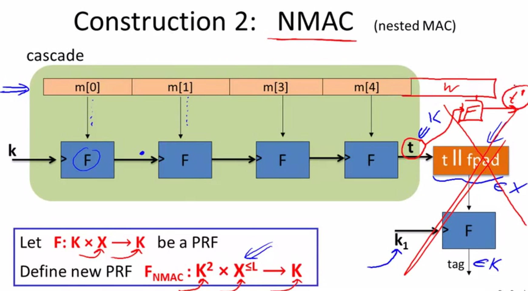 NMAC 用到的 PRF 的分组长度 |X| 远远大于密钥长度,把固定的补齐附在信息后面,fpad 是固定的补齐。