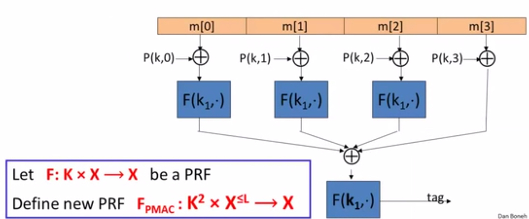 PMAC 可并行,使用了一个底层的 PRF 来构建一个 PRF去处理长得多的信息。密钥是一对密钥,一个给 PRF,另一个给掩码函数 P。采用与 CMAC 类似的补齐函数,不需要加假的分组。